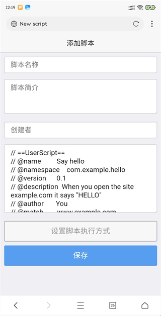 前往浏览器设置》浏览器脚本》点击右上角的“添加脚本”按钮,选择“新建脚本”。然后,把把代码粘贴至“JavaScript代码”编辑区域点击保存即可。对于符合规范的油猴脚本,无需填写“脚本名称”、“脚本简介”等字段,浏览器会自动从元数据中提取这些信息保存。
