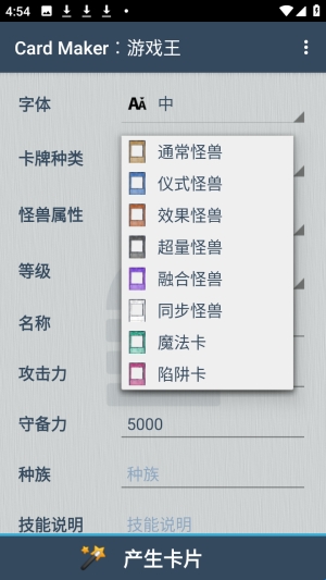 你是一名游戏王的忠实玩家吗?在平时游玩游戏王时,需要带着自己组合的卡组前往与其他用户对战,但是游戏卡牌更新的速度非常的慢,那么就可以自己来制作一些卡牌用来对战;而Card Maker for YuGiOh就是一款支持用户自定义制作卡牌的软件哦,如卡牌的种类、怪兽属性、等级、名称、攻击和防御等都可以由用户进行设定,然后就可以生成卡牌啦。