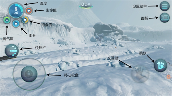 1、游戏开始我们在一处冰川中,首先需要熟悉游戏的键位以及作用,其中包括移动、跳跃、交互,左上角代表主角各项状态,右上角面板中可以查看物品蓝图以及日志资料。
