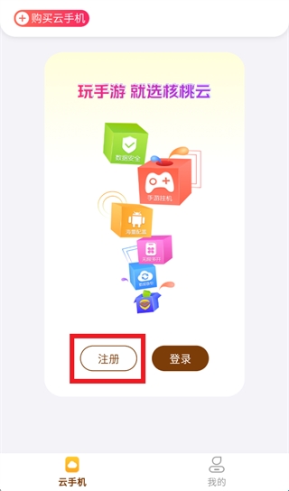 1、打开核桃云手机app,进入后点击注册。