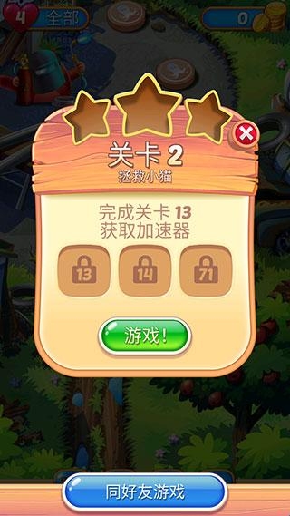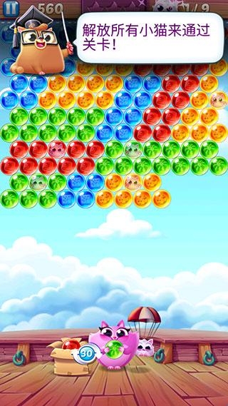 2、玩家需要通过数百个关卡来解救被困在泡泡中的所有猫。关卡数量会不断更新,难度会逐渐增加。
