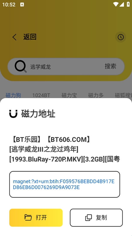 4、点击目标磁力链接,界面会弹出“打开”和“复制”两个选项。