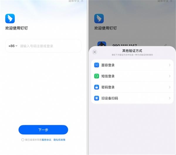 1、目前默认支持旧设备扫码、短信登录、密码登录,若之前在使用钉钉账号时有绑定指纹/人脸/支付宝/邮箱,登录方式会增加这几种验证方式,可任选一种方式验证身份登录。