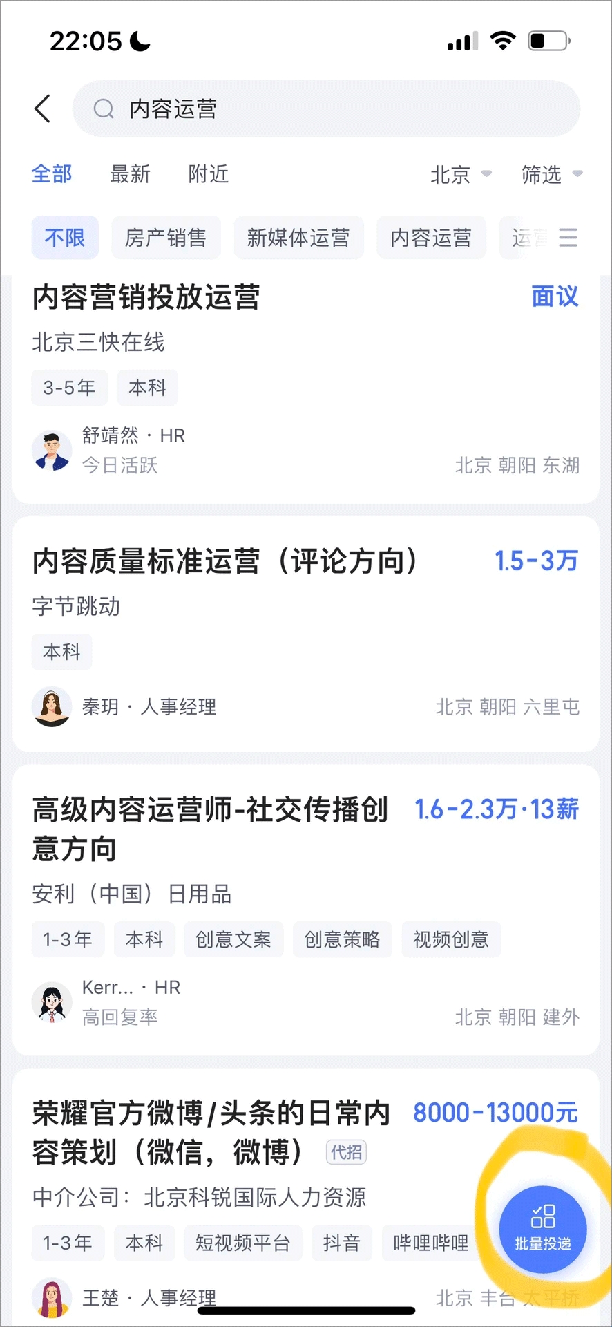 1、在首页的“搜索栏”里输入“职位”,如内容运营,然后右下角会出现“批量投递”的蓝色小圈圈,点它。