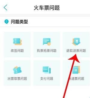 3、之后在【火车票问题】里,选择退款退票问题