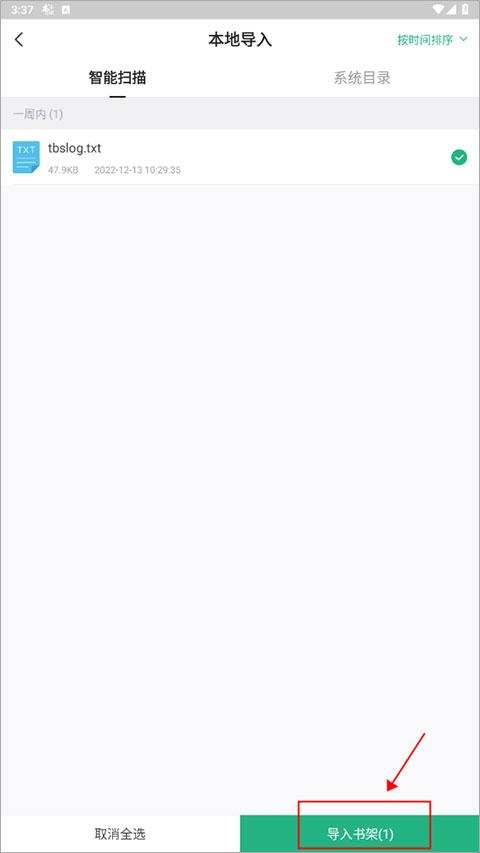 2、进入到本地导入界面后,选择你的TXT文档,点击“导入书架”就能够导入啦。