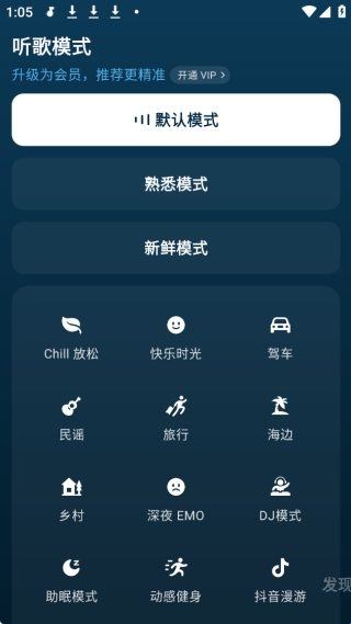 2、三种基础模式点击即可切换,用户还可以根据喜爱的歌曲类型选择下方更多的模式体验。