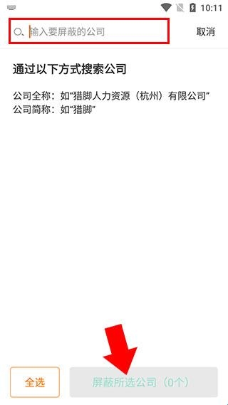 6、输入相应关键字,然后选择屏蔽或者点击“全选”,最后点击“屏蔽所选公司”即可