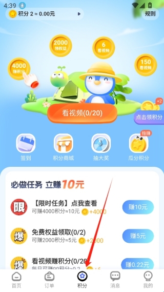 3、在“积分”栏目中,用户可以完成众多任务来获取积分,积分可用来兑礼品或者折算钱使用。