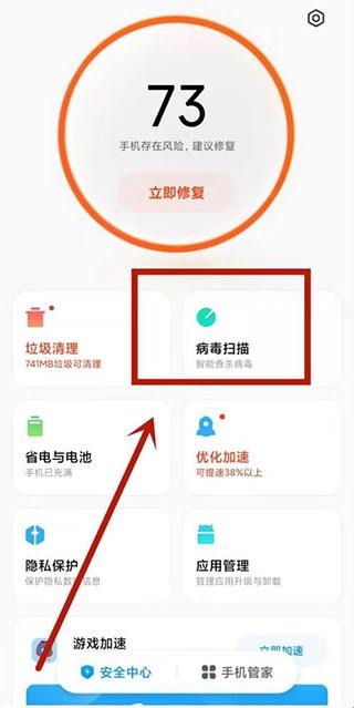 1、在手机管家中,选择一下页面的病毒扫描选项;
