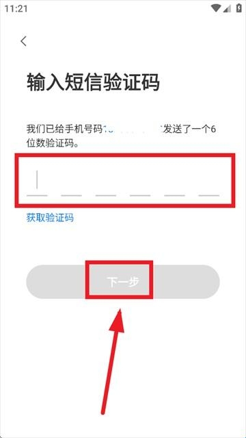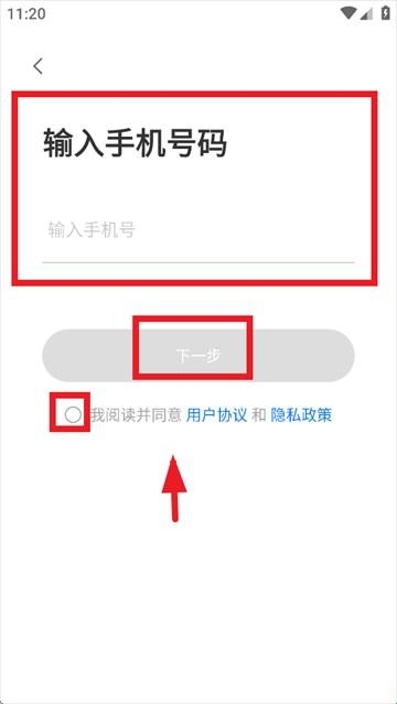 2、输入手机号,勾选我阅读并同意用户协议和隐私政策,点击下一步