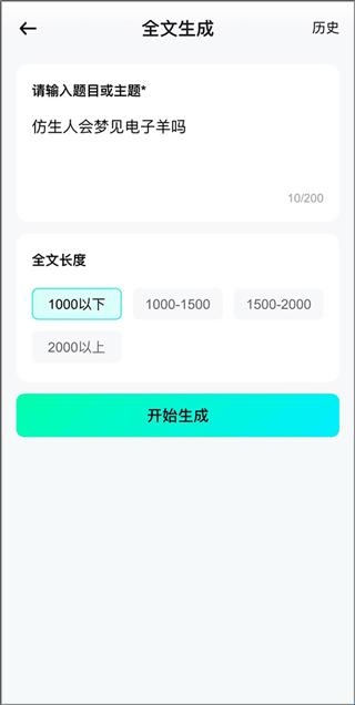 2、输入题目与主题,选择全文长度,点击“开始生成”。