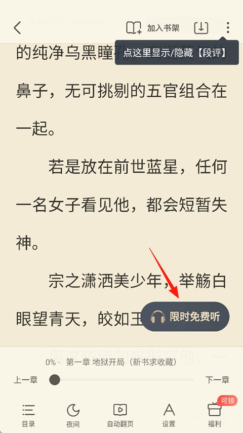 2、在打开的阅读页面中选择右下角的限时免费听按钮;