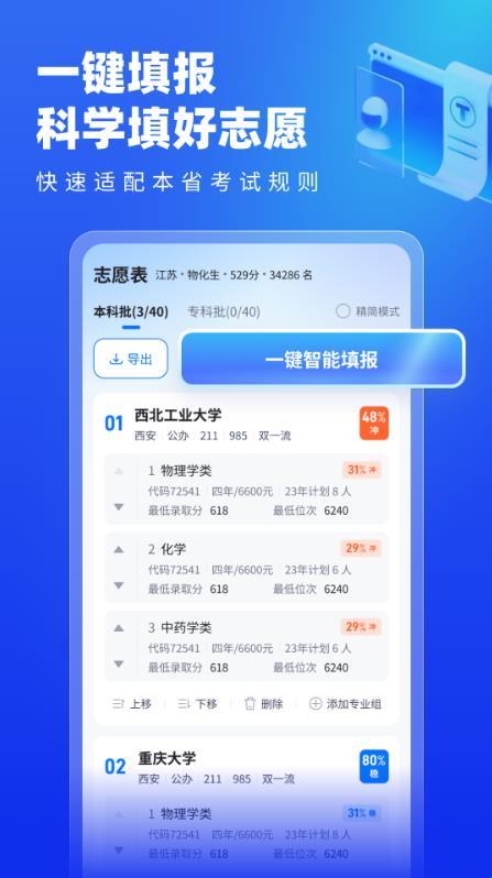 志愿填报模拟:进行多种组合的志愿填报,提前体验填报流程。