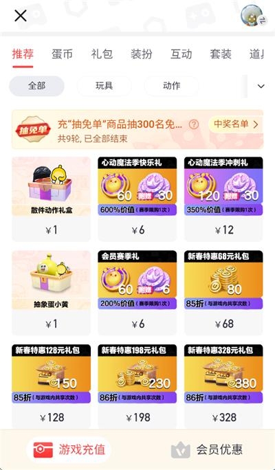 2、进去之后你可以看到各种档位的充值金额,除了资源,还有装扮、动作和道具等。