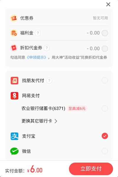 3、点击其中一个档位,选择支付方式,点击右下角的【立即支付】就完成充值了。
