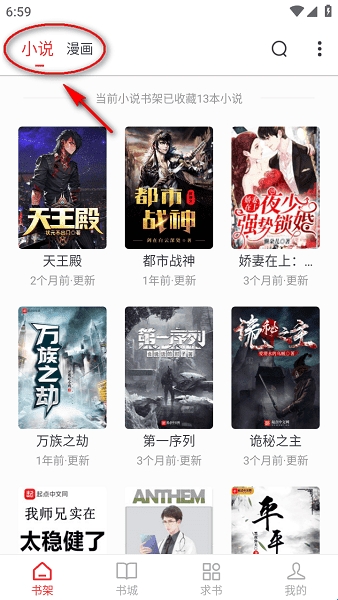 2、进入软件后,左上角可以切换小说或者漫画,如图所示;