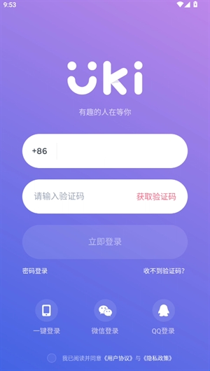 1、打开Uki闪聊后,进入注册登录界面,在这里大家可以选择使用手机号、微信、QQ三种方式进行登录注册。