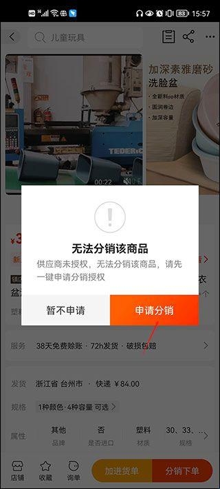 1、在阿里巴巴应用中,找到需要一件代发商品。在商品分销项目栏中,点击分销下单按钮。