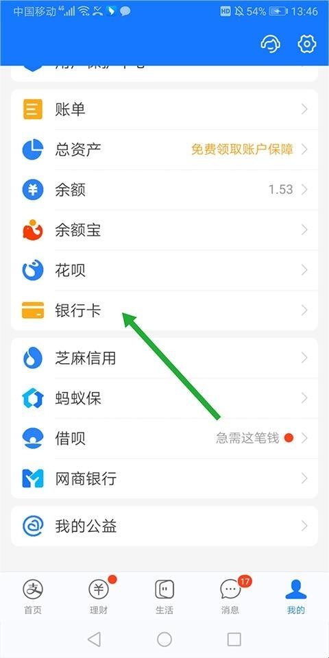 4、手机登录支付宝,点击【我的】一【银行卡】,
