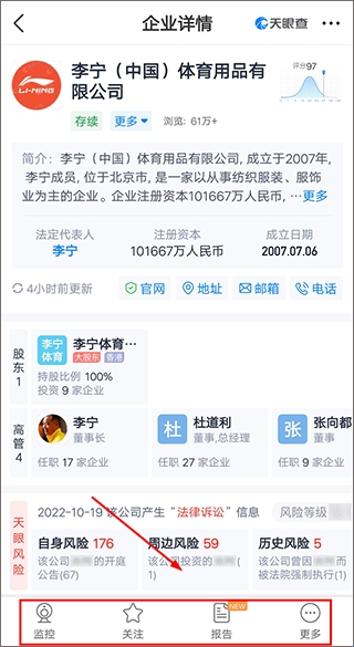 3、在公司的详细介绍页面,你可在这查询到该公司的:股东,企业背景,司法风险,经营风险,企业发展,经营信息等信息。如你对该公司感兴趣,还可以关注或监控该公司。
