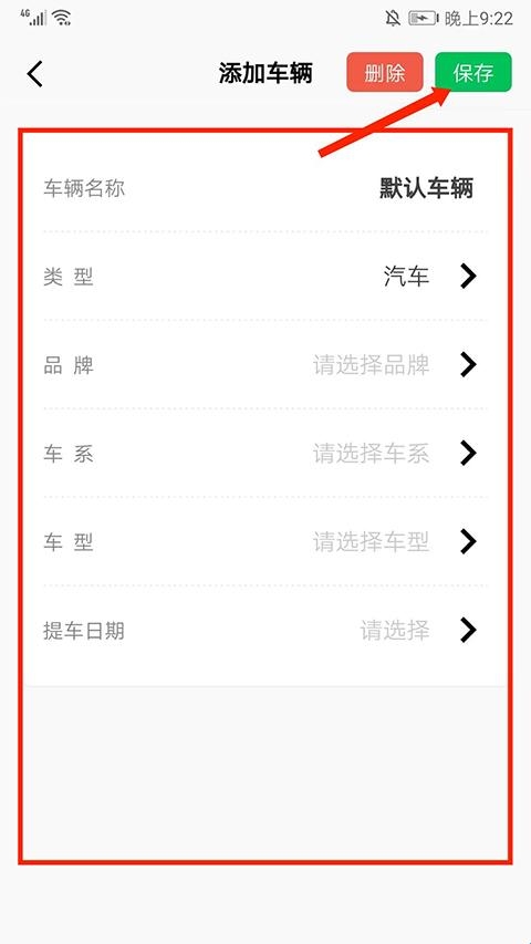 3、进入添加车辆界面,依次填写好【类型】、【品牌】、【车系】、【车型】以及【提车日期】后,选择右上角【保存】选项,