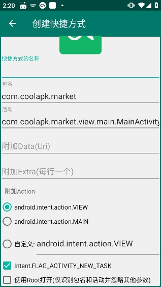 4.除此之外例如快捷方式名称、包名、活动、附加action等各项内容我们也可自定义切换
