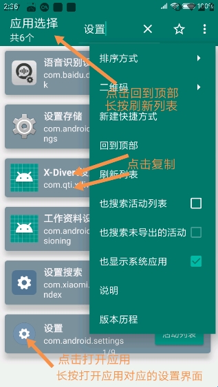 1.首先打开创建快捷方式,进入后在最上方进行检索目标app,点击左上方可返回并刷新列表,点击目标程序、长按可打开应用相应的设置界面