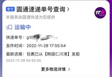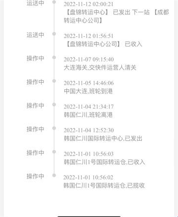第二种是走首尔仓,仁川港的,这种到盘锦前你在菜鸟和快递100查不到,但是可以百度查,百度就只有下图这种物流,点进去物流详情是没有国际物流的,只有清关完到盘锦之后才会有物流详情参考p5,就是菜鸟和快递100能查到的。另外百度查这个单号很容易抽风,偶尔说你的单号暂无物流,但是你只要再试两次就有了。