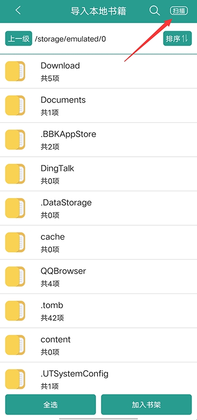 3、接着在手机目录下,找到你需要导入小说的保存文件夹,可直接点击“扫描”查找